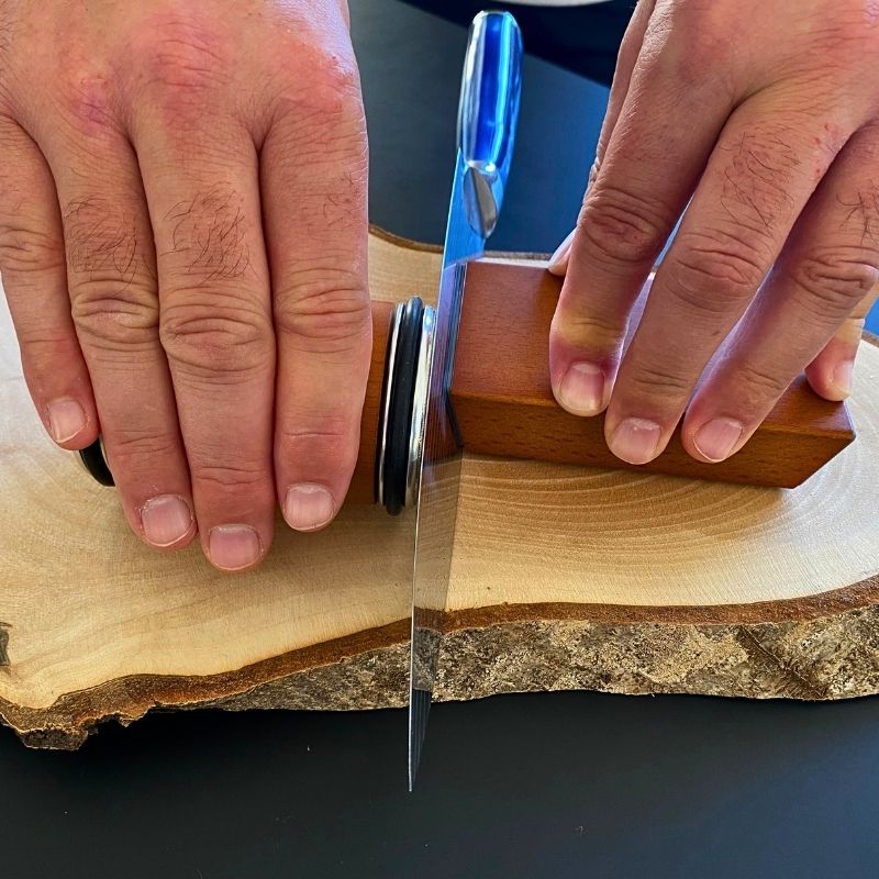 Pour un résultat optimal, laissez le rouleau faire le travail d’aiguisage pendant que le bloc maintient automatiquement le bon angle de découpe.